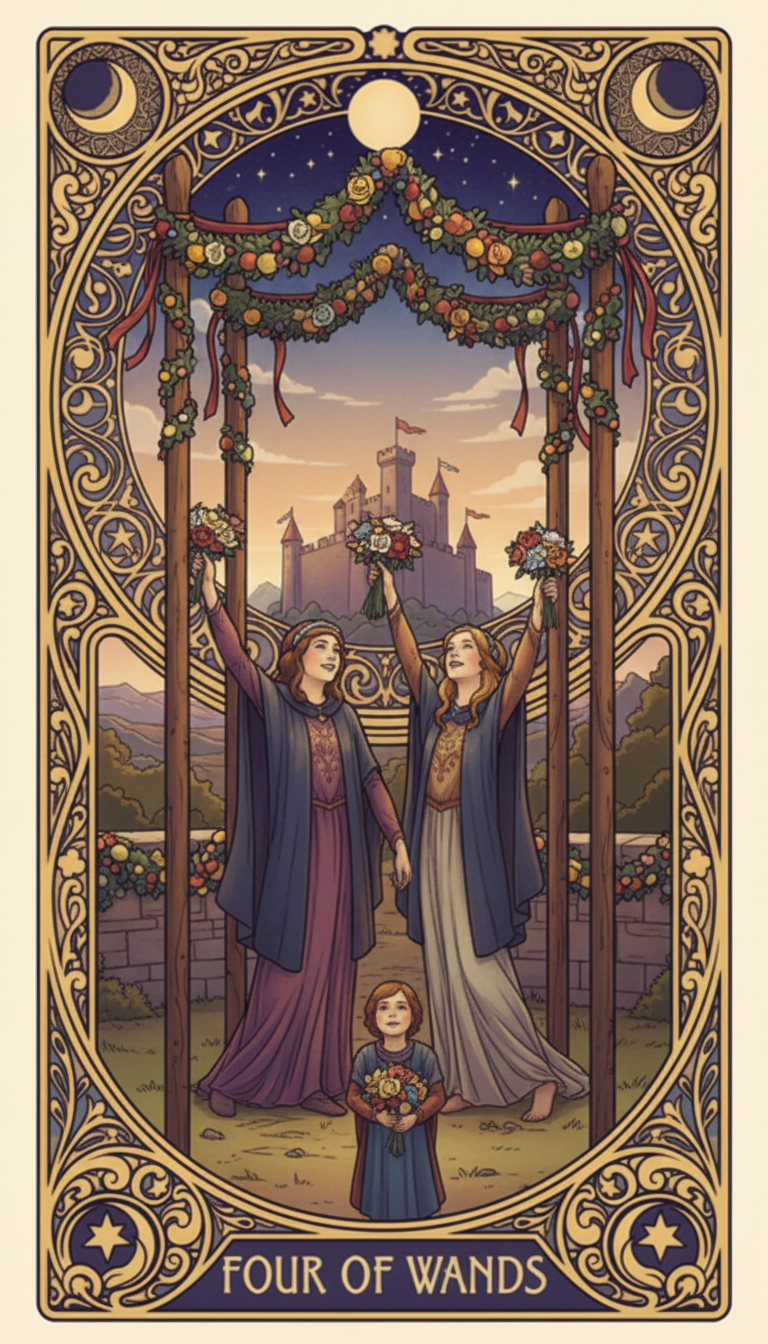 The Four of Wands teaches you the importance of wholeheartedly enjoying life's happy moments. In the busyness of daily life, take time to pause, celebrate your achievements, and express gratitude. The family and community that support you are your strongest foundation of all. Cherish those bonds and share your joy — doing so will open the path to even greater prosperity.