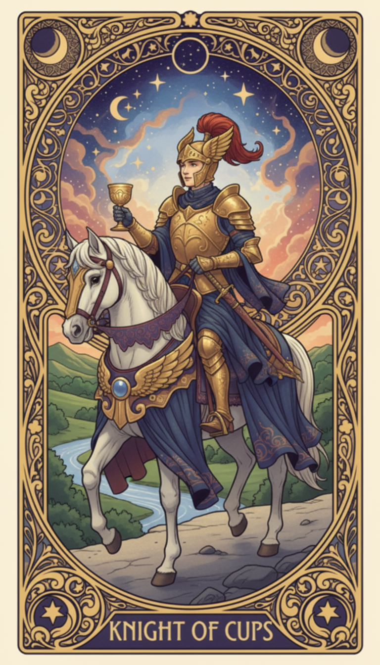 The Knight of Cups arrives bearing an emotional message that demands your attention. A tarot reading can help you distinguish genuine feeling from beautiful illusion — and decide whether to follow where the heart leads.