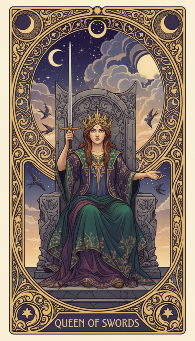 You pulled the Queen of Swords and recognized her immediately — the woman who sees through everything. She is the friend who tells you what you need to hear instead of what you want to hear. She is the colleague whose silence in a meeting means she has already identified the flaw in your plan. She is the version of yourself that surfaces after you have been hurt enough times to stop tolerating nonsense.