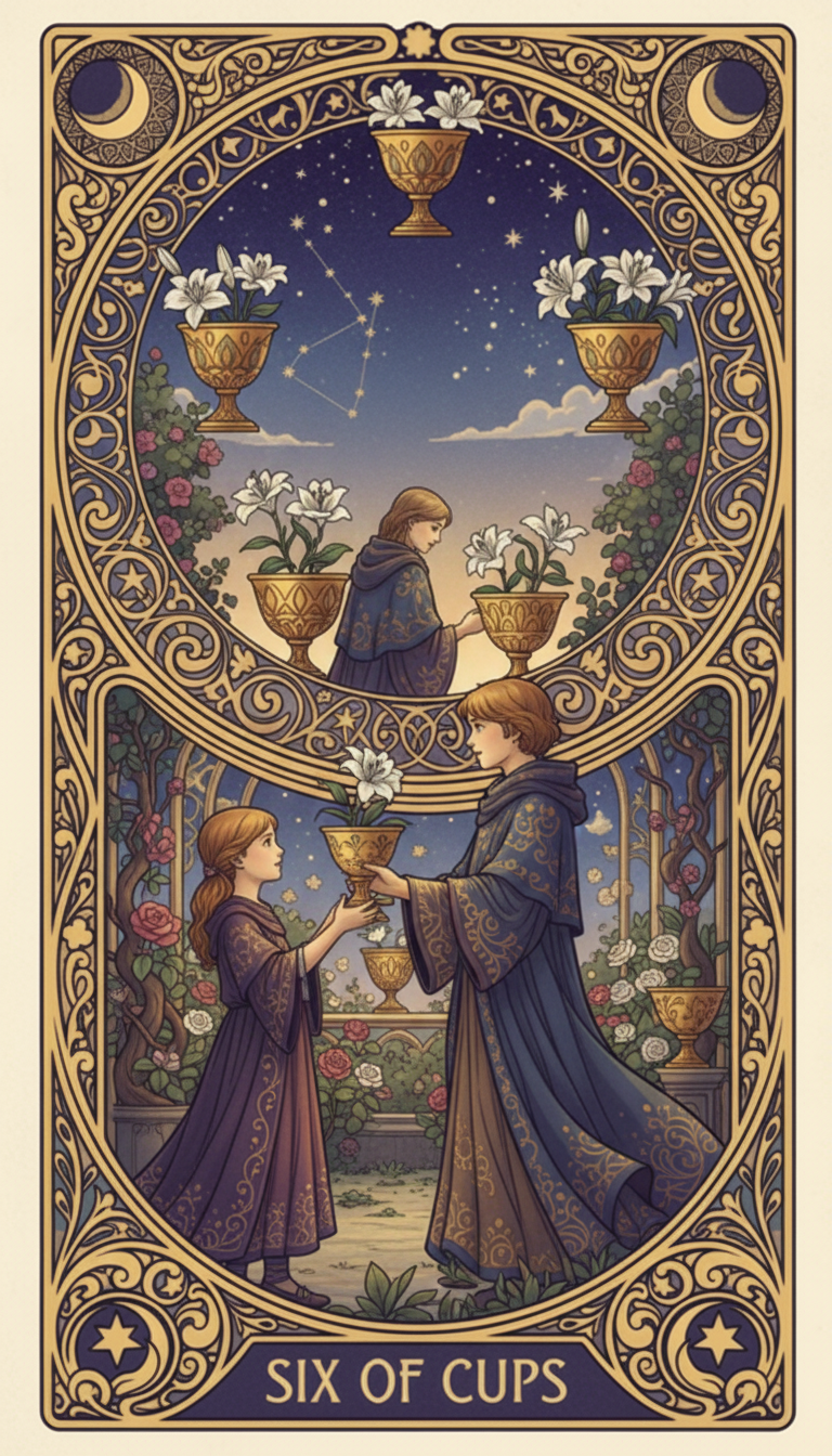 URANIZE Editorial Insight: The Six of Cups is frequently drawn by people at career crossroads, and they are always surprised. They expect career cards and get a card about childhood. But the connection is direct: the thing you loved doing at age ten — before anyone told you what was practical, profitable, or realistic — often contains the clearest signal about what work would actually fulfill you. The Six of Cups does not ask you to become a child again. It asks you to remember what you cared about before the world told you to care about something else. That memory is data. Use it.