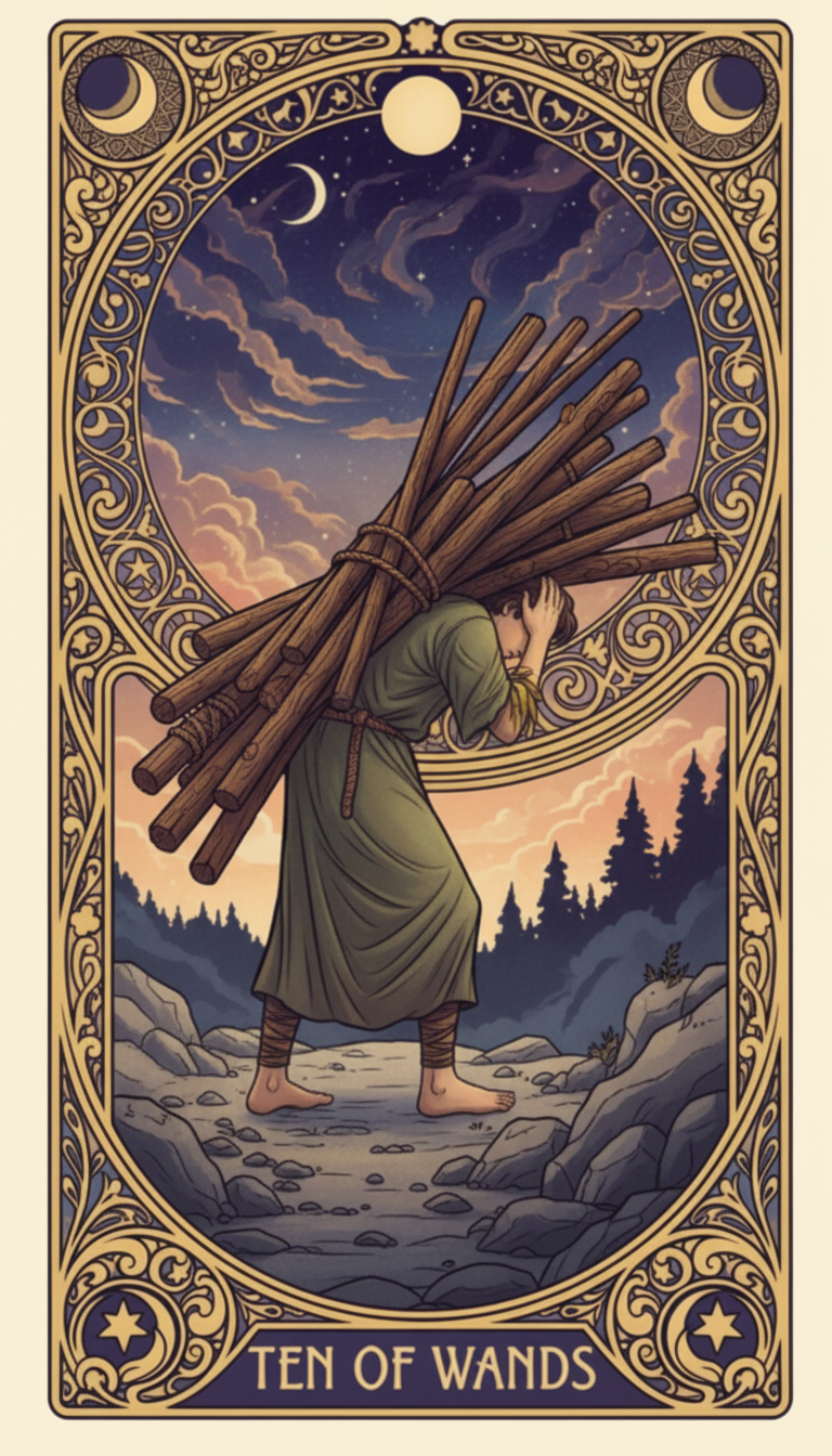 You drew the Ten of Wands and you already know exactly why — because you are carrying too much and you have known it for weeks. The figure in this card is bent under the weight of ten wands, pressing forward toward a town in the distance while the load blocks their entire view. They cannot see where they are going. They can only keep walking.