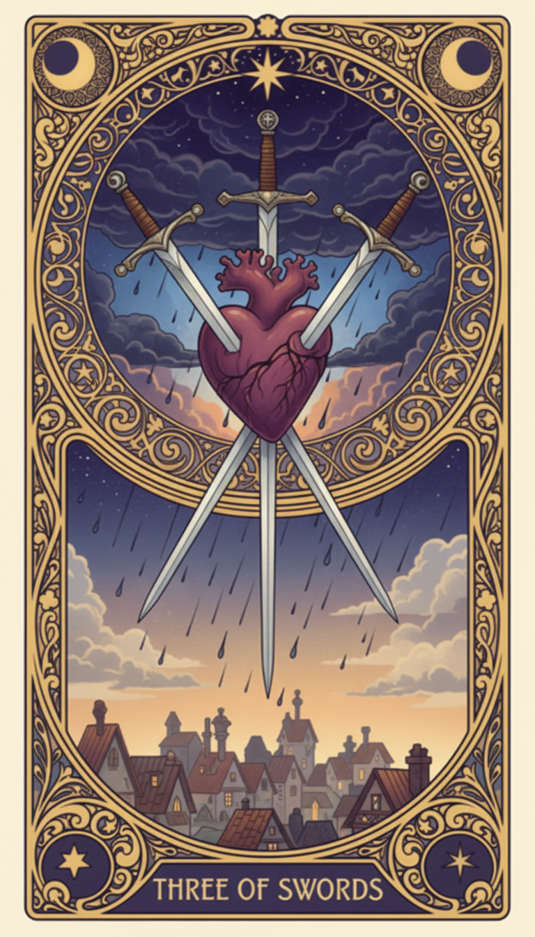 You drew the Three of Swords — and your stomach dropped. No one wants to see three blades through a heart. But this card did not cause the pain you are feeling. It is confirming pain that already exists. Something has hurt you — a betrayal, a rejection, words that cut deeper than the person who said them will ever understand — and you have been trying to function as if you are fine. You are not fine, and this card says that is okay.